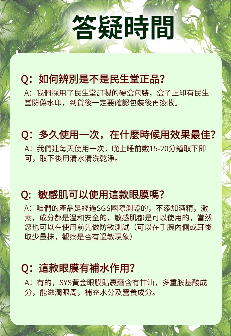 半小時前民生堂超值優惠大促【吳醫師特調推薦】綠海藻水晶眼膜 中藥成分 100%正品 好康開團~無效全額退 - 【分享裝,眼袋不反彈】買4送6 10罐 僅需NT$1998 均價199/罐