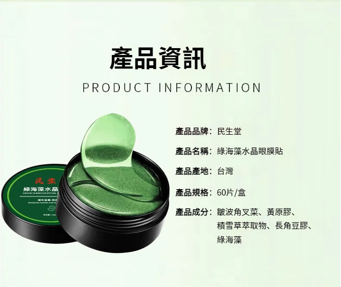 半小時前民生堂超值優惠大促【吳醫師特調推薦】綠海藻水晶眼膜 中藥成分 100%正品 好康開團~無效全額退 - 【祛嚴重眼袋】買3送3 6罐 僅需NT$1698 均價283/罐