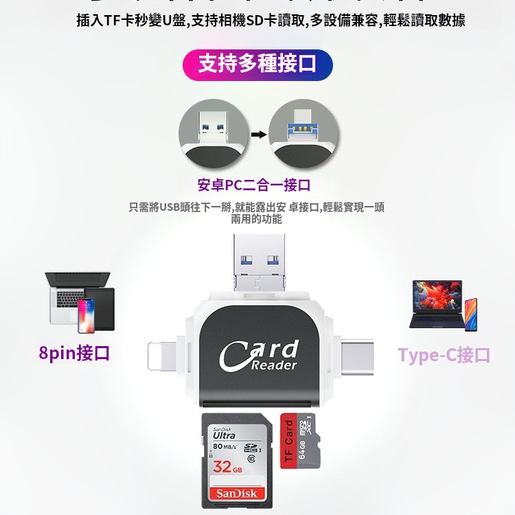 15分鐘前多功能讀卡器適用於蘋果安卓手機 - 【優惠價】四合一多功能讀卡機 一入組 NT$788