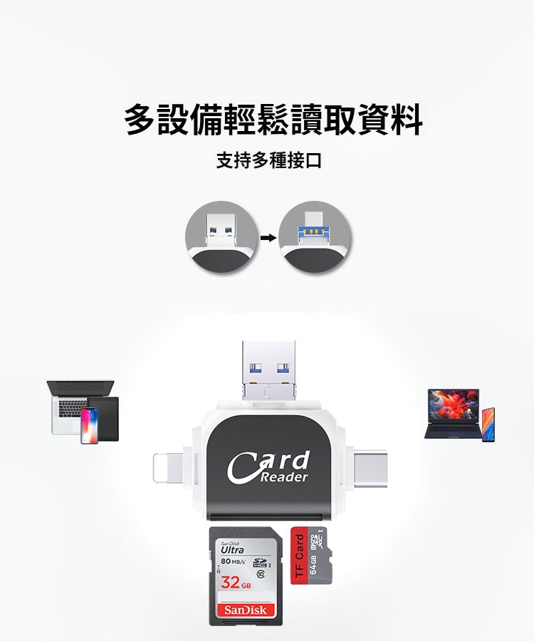 5分鐘前多功能讀卡器適用於蘋果安卓手機 - 【優惠價】四合一多功能讀卡機 一入組 NT$788